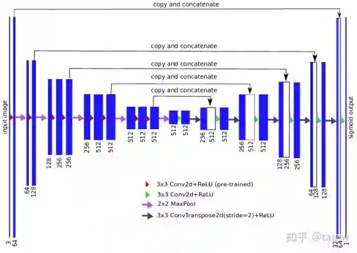 TernausNet全称为"TernausNet: U-Net with VGG11 Encoder Pre-Trained on ImageNet for Image Segmentation"[6]。该网络将U-Net中的编码器替换为VGG11,并在ImageNet上进行预训练,从735个参赛队伍中脱颖而出,取得了Kaggle 二手车分割挑战赛(Carvana Image Masking Challenge)第一名。代码链接: