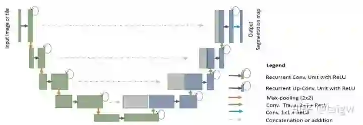 R2U-Net全称叫做Recurrent Residual CNN-based U-Net[9]。该方法将残差连接和循环卷积结合起来,用于替换U-Net中原来的子模块,如下图所示