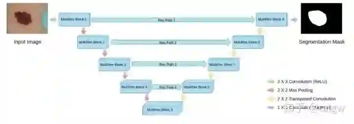 该网络的结构图如下图所示,其中各个MultiRes模块的内部即为上图所示。