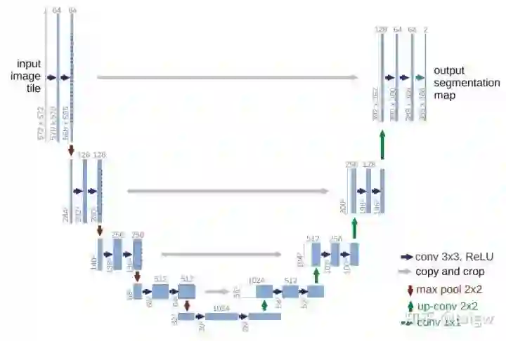 U-Net的结构如下图所示,左侧可视为一个编码器,右侧可视为一个解码器。编码器有四个子模块,每个子模块包含两个卷积层,每个子模块之后有一个通过max pool实现的下采样层。输入图像的分辨率是572x572, 第1-5个模块的分辨率分别是572x572, 284x284, 140x140, 68x68和32x32。由于卷积使用的是valid模式,故这里后一个子模块的分辨率等于(前一个子模块的分辨率-4)/2。解码器包含四个子模块,分辨率通过上采样操作依次上升,直到与输入图像的分辨率一致(由于卷积使用的是valid模式,实际输出比输入图像小一些)。该网络还使用了跳跃连接,将上采样结果与编码器中具有相同分辨率的子模块的输出进行连接,作为解码器中下一个子模块的输入。