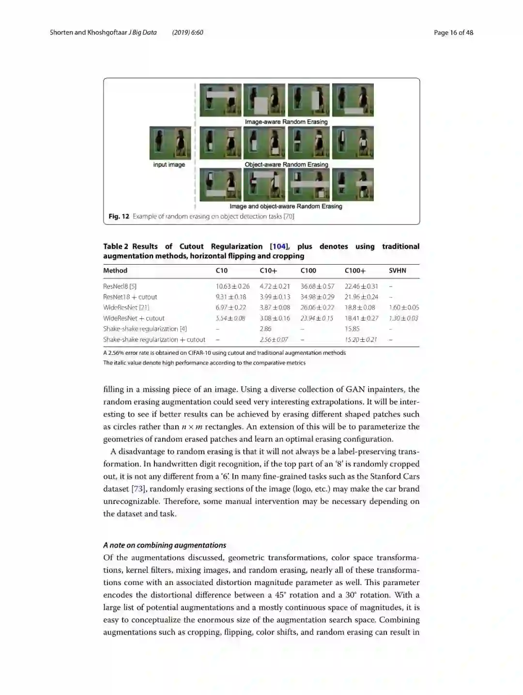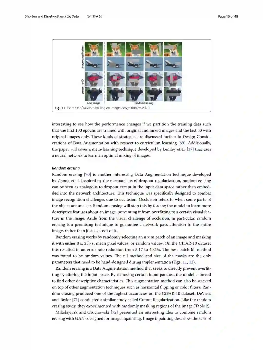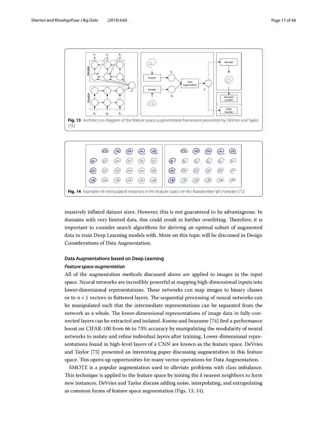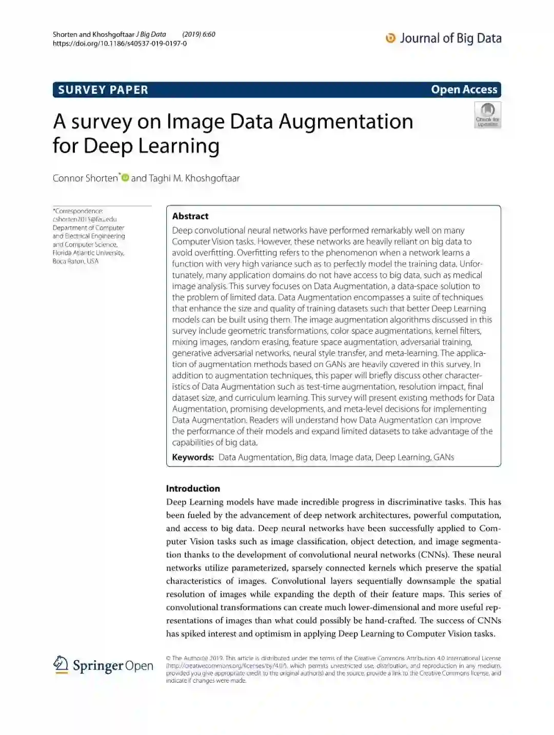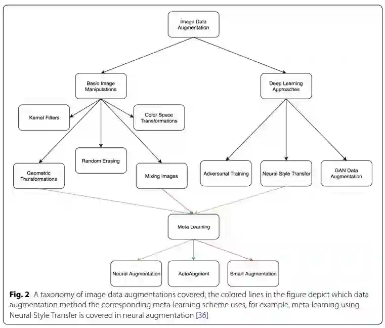 本篇综述重点关注于数据增强任务,这是一种数据有限场景下的解决方案,可以通过一系列的技术手段,来增强训练数据集的大小和质量,从而可以更加高质量的完成深度学习任务。在本文中,将包含几何变换、颜色空间增强、kernel滤波器,混合图像、随机擦出、特征空间增强、对抗训练、生成对抗网络、神经风格转移和元学习等技术方案。另外,还简要讨论了数据增强的其他特征等内容。