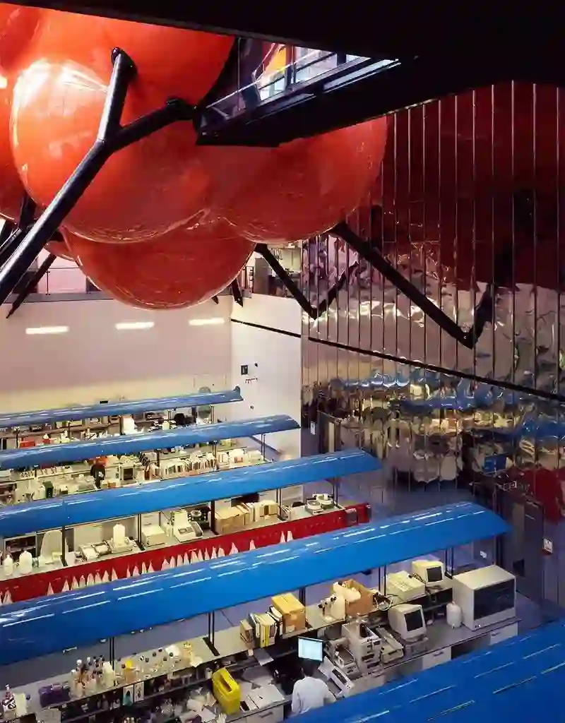 本世纪初,Herzog 和 de Meuron 为瑞士制药公司爱可泰隆设计了实验大楼,Gehry 等人为诺华设计了实验大楼。此外,已故建筑师 Zaha Hadid 设计了新加坡的纬壹(one-north)科技城。这些充满时尚气息、光芒四射的大楼设计起初是为了吸引风投,鼓励突破。