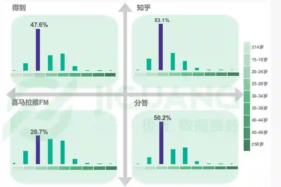 在年龄分布上,知识付费 app 用户年龄以20~24岁为主。得到 app 的用户中20~24岁占比为47.6%,知乎为53.1%,20~24岁用户占比在分答上则为50.2%,喜马拉雅FM人群分布较均衡。