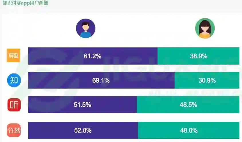 在用户性别分布上,知识付费 app 的男性用户比例稍高。其中得到 app 的男性用户占比为61.2%,知乎的男性用户占比为69.1%,喜马拉雅FM和分答的男性占比分别为51.5%和52%。