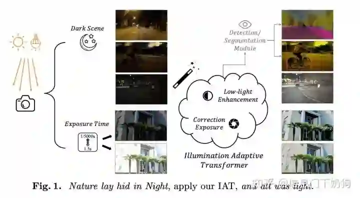 自然场景下存在着各种不良光照场景,如低光照环境和过(欠)曝光环境,相机在不良光照下完成摄影任务时,因为过多/过少的光子数量,和相机内部的处理(如低光照场景需要调高ISO,这会导致噪声也同时放大)以及后续的ISP,往往得到的图像也会收到影响,非正常光照的图像无论感观还是视觉任务都会收到很大的影响。区别于传统的HE或者RetiNex做法以及此前的CNN做法,IAT从光转换的角度出发,通过物理模型建立了一个Transformer-based方法来完成。
