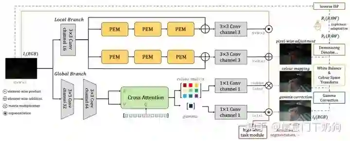 区别于正统的ISP,我们设计的色彩矩阵与gamma数值都是针对每张图像进行调整,相当于给每张图像都假定一个专属的特定ISP数值来完成增强任务,曝光矫正任务以及高层次视觉任务。