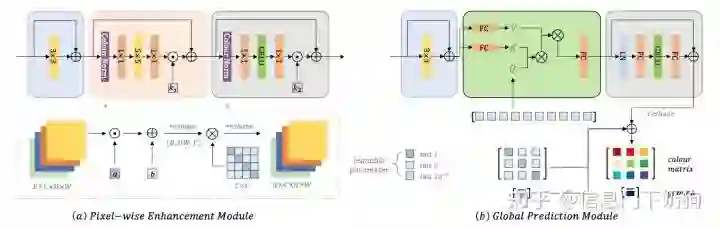 我们总体简化为公式: 其中 是我们希望得到的target图像, 是输入的不良光照图像, 是像素级别的乘法图,尺寸大小与 相同, 同时 是像素级别的加法图。 是控制颜色的色彩矩阵, 是gamma矫正的gamma数值。 负责控制像素级别的细节信息,同时 负责控制整张图像级别的全局信息。