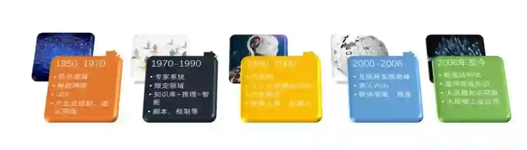 在进入知识图谱领域之前,我们不妨先来回顾一下知识工程四十年多来发展历程。对知识工程的演进过程和技术进展进行总结后,我们可以将知识工程分成五个标志性的阶段:图灵测试时期、专家系统时期、Web1.0 万维网时期、Web2.0 群体智能时期以及Web 3.0 知识图谱时期,如下图所示: