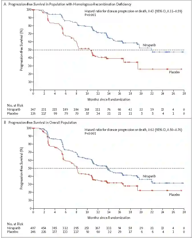 该研究结果发现, 在733例随机分配的患者中,373例(50.9%)存在肿瘤同源重组缺陷(HR),针对这类患者,Niraparib组的无进展生存期(21.9个月)明显长于安慰剂组(10.4个月)。在总体人群中,两组对应的无进展生存期分别为13.8个月和8.2个月(危险比0.62;95% CI, 0.50 ~ 0.76;P < 0.001)。在24个月的中期分析中,Niraparib组的总生存率为84%,安慰剂组的总生存率为77%(危险比为0.70;95% CI, 0.44 - 1.11)。