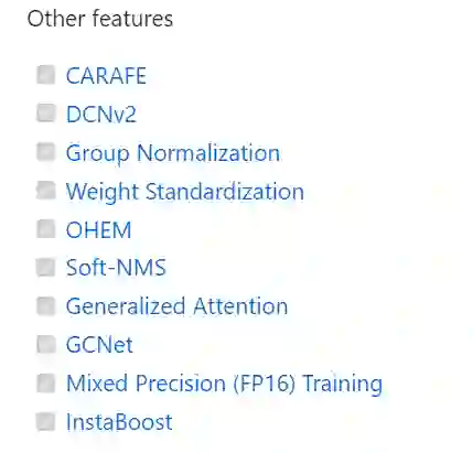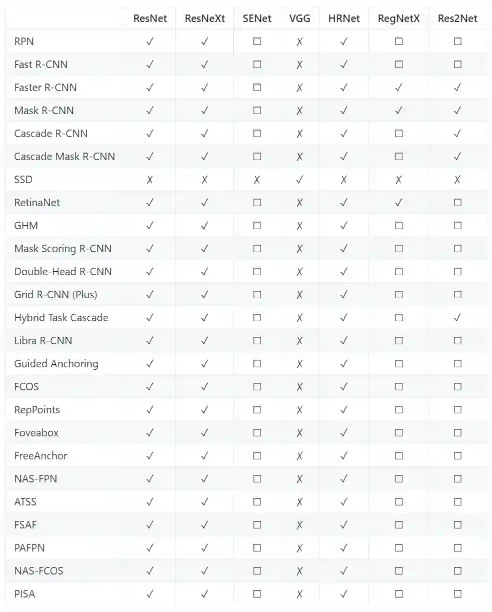 截至 2020 年 5 月底,MMDetection 官方模型库已经支持了35篇论文中的算法,提供了超过 250 个预训练模型,是目标检测领域最大规模的模型库。除此之外,还有 16 篇论文在 Github 上开源了基于 MMDetection 的代码。目前官方支持的方法如图所示: