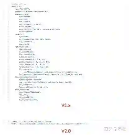 V2.0改进:我们设计了新的 config 系统,支持了多重继承机制。将常用的数据集配置、基础模型以及训练策略放到了 _base_ 文件夹中,每个新的 config 只需要继承一个或者多个已有的 config,然后对其中需要修改的字段进行重载即可。下图是 Mask R-CNN R-101 的配置文件在 1.0 和 2.0 版本的对比。V2.0 版本 只需要 2 行,而且所有的改动一目了然,如下图所示。