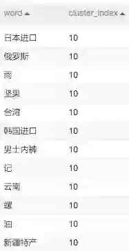 现在已经产生了词向量,接下来只需要计算出哪些词的向量距离比较近,就可以实现按照意义将标签词归类。这里采用kmeans算法来自动归类,聚类结果展示的是每个词属于哪个聚类簇: