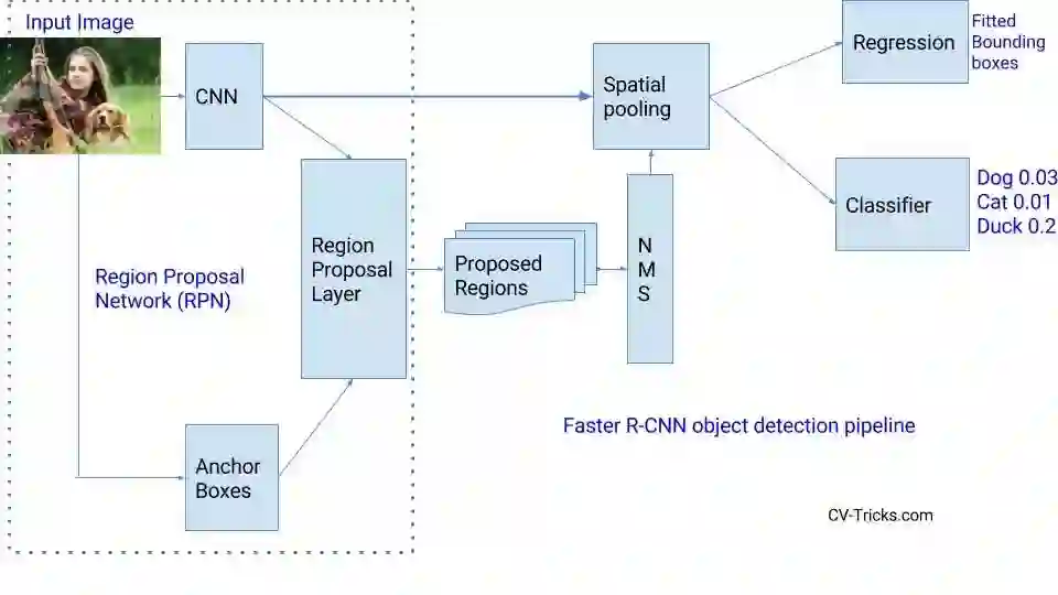 为了应对长宽比和物体尺寸的变化,Faster R-CNN引入了锚框(anchor boxes)的思想。在每个位置,原始论文使用128x128,256×256和512×512比例的三种锚框。同样,对于宽高比,它使用三种宽高比:1:1,2:1和1:2。所以,在每个位置我们有总共9个boxes,RPN预测这9个boxes是背景或前景的概率。我们应用 bounding box回归来改进每个位置的锚框。因此,RPN给出了各种大小的bounding boxes和其相应每个类的概率。像Fast-RCNN一样,可以通过应用空间池化来进一步传递不同大小的边界框。 剩下的网络与Fast-RCNN相似。 . Faster-RCNN比Fast-RCNN快10倍,在VOC-2007数据集上准确率一样。 这就是为什么Faster-RCNN一直是最精确的目标检测算法之一。 这是RCNN各种版本之间的速度比较。