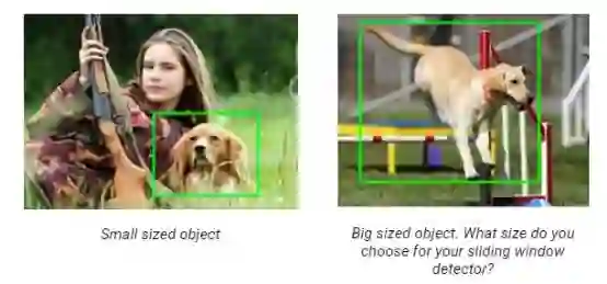 每个窗口作为一个样本,使用分类器进行预测,该分类器预测窗口中的目标的类别(如果什么都没有则为背景)。因此,我们知道图像中的目标的类别和位置。 听起来很简单! 那么还有一些问题。你怎么知道窗口的大小,以便它总是包含图像? 看例子: