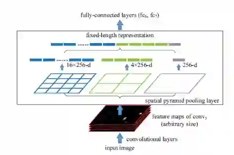还有一个挑战:我们需要为CNN的全连接层产生固定大小的输入,所以SPP使用了更多的技巧。它在最后的卷积层之后使用空间金字塔(spatial pooling ),而不是传统上使用的最大池化(max-pooling)。SPP层将任意大小的区域划分为恒定数量的bins,并且在每个bin上执行最大池化(max-pooling)。由于bins的数量保持不变,所以如下图所示产生恒定的尺寸矢量。