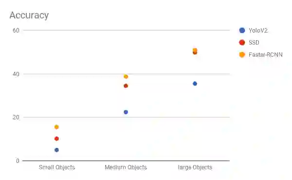 SSD似乎是一个不错的选择,因为我们可以在视频上运行它,而且精度的折衷很少。 但是,可能并不那么简单,请查看此图表,它比较了SSD,YOLO和Faster-RCNN在各种大小物体上的性能。 在大尺寸下,SSD似乎与Faster-RCNN类似。 但是,当物体尺寸较小时,我们以精度来衡量,其差距就会扩大。