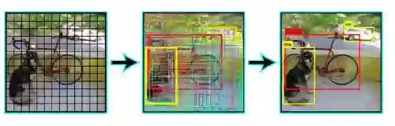 预测出了SxSxN个 boxes。然而,这些框中的大部分都具有低置信度分数。如果我们设置一个阈值(如30%的置信度)可以删除其中的大部分,如下面的例子所示