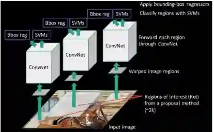 由于我们已经将目标检测建模为分类问题,成功取决于分类的准确性。深度学习的兴起之后,显而易见的想法是用更准确的基于卷积神经网络的分类器代替基于HOG分类器。但是,有一个问题。CNN太慢,计算上非常昂贵。在滑动窗口检测器产生的很多patch上运行CNN是不可能的。R-CNN通过使用称为选择性搜索的目标提议算法( Selective Search)来解决这个问题,该算法减少了送给分类器的边界框的数量,每次差不多接近2000个建议区域。选择性搜索使用局部关键特征,如纹理,强度,颜色和/或内部度量等来生成目标的所有可能的位置。现在,我们可以把这些产生的区域喂给我们的基于CNN的分类器。请记住,CNN的全连接部分需要一个固定大小的输入,所以我们调整(不保留宽高比)所有生成的框到一个固定的大小(224×224的VGG),并馈送到CNN部分。因此,R-CNN有三个重要部分: