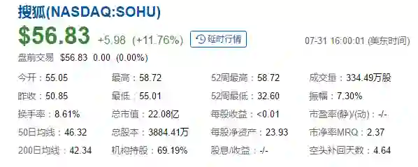 受业绩表现超出预期以及搜狗计划在美秘密IPO等刺激,7月31日当天,搜狐盘前大涨22%,全天涨幅超过11.76%,创下近4年来最大涨幅。