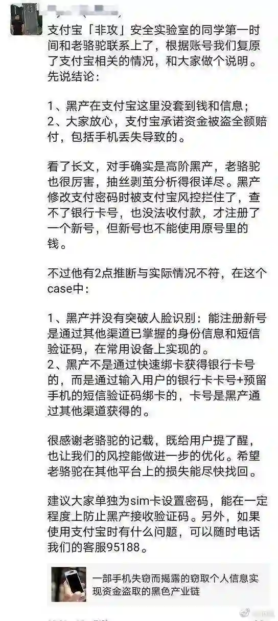 10月9日下午消息,近日,一篇标题为《一部手机失窃而揭露的窃取个人信息实现资金盗取的黑色产业链》的文章引发关注和热议,文章由一位信息安全专家根据亲身经历梳理。支付宝相关部门人员在朋友圈回应称支付宝“非攻”安全实验室的同学第一时间和老骆驼联系上了,并了解了相关情况。回应指出,文章所披露的黑产在支付宝里没套到钱和信息;且支付宝承诺资金被盗全额赔付,包括手机丢失导致的。(新浪)