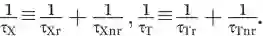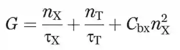 nX, nT分别为电中性激子跟带负电带电激子的数量密度; τX, τT分别为电中性激子跟带负电带电激子的生命期;Cbx为双激子消灭系数。激子跟带电激子的生命期还包括发光(τXr, τTr)与非辐射(τXnr, τTnr)两个部分: