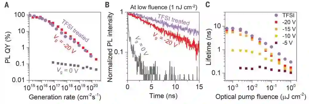图4. A, 比较Vg = -20 V,Vg =0 V及TFSI处理过后二硫化钼的PL QY。B, 比较Vg =-20 V,Vg = 0 V及TFSI处理过后二硫化钼的发光衰减生命期。C, 发光衰减生命期与光强密度的关系。