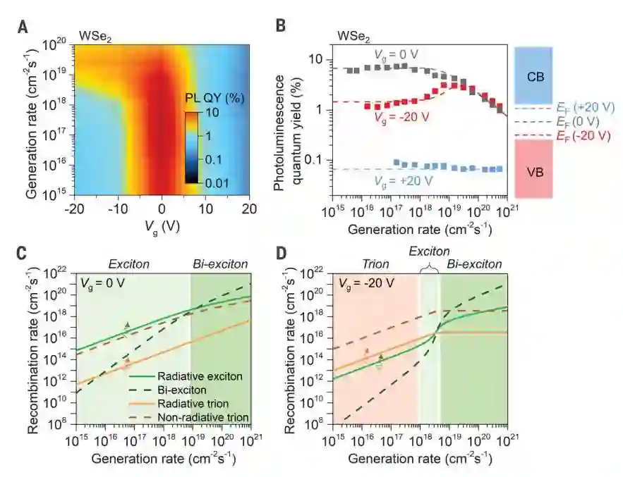 经由此模型,我们也可以精确地描述了其他过度金属硫属化物的单层材料的复合机制。与二硫化钼类似的,一开始高浓度的背景电子就存在于单层二硫化钨中。当Vg = -20 V时,背景电子的浓度降低,激子的发光复合成为主要复合途径,因此PLQY可以达到接近~90%(图S5)。二硒化钨WSe2及二硒化钼MoSe2在Vg = 0 V时则是几乎没有任何的背景电子或电洞(图3A和3B)。因此,激子的发光复合一开始就是主要的复合途径(图3C)。增加或降低Vg,会使费米能级分别更接近导带或价带(图3B)。在Vg = + 20 V和-20 V时,分别产生负的和正的带电激子。在这情况下带电激子的非辐射复合为主要复合途径,因此PL QY极低。特别的是,在Vg= - 20 V的情况下,PL QY在1018 <G <10 19 cm -2 s- 1范围中随着载流子产生率G升高而逐渐上升。这种不寻常的现象也可以从我们的模型来解释。具体而言,在G 达到1018 cm -2 s- 1时,带正电的带电激子浓度达到饱和,达到材料内部总电荷浓度的上限。超过该浓度,过量的激子不能再形成带电激子。继续增加G,中性的激子复合发光开始成为主要复合途径,造成QY渐渐上升,直到双激子的非辐射复合开始发生而QY开始下降(图3D)。最后,我们发现过度金属硒化物即使在其费米能级接近能带间隙时也未达到接近100% PL QY。原因可能是这些材料为间接带隙,或是存在暗激子的效应。