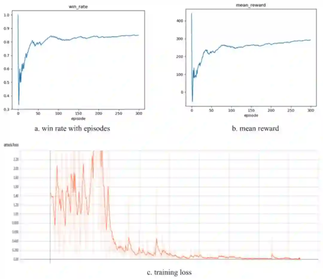 与本文之前的研究不同,这两个网络是同时为外部队伍和内部队伍构建和训练的。图 8 显示了外部队伍的训练结果(内部队伍的训练结果与此类似)。从图中不难看出,训练收敛得非常快(少于 150 个片段,每个片段有 5 场游戏)。外部队伍对战 SL-Human 的胜率提高了 80%,而训练损失接近 0。