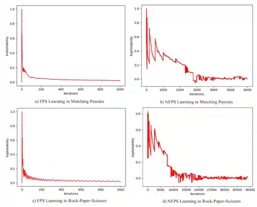 浙大研究人员在改进版无限制州扑克(Leduc Hold』em)中对 ANFSP 和 NFSP 进行比较。为了简化计算,浙大研究人员在无限制德州扑克中将每轮的最大赌注大小限制为 2。实验研究了改进版无限制德州扑克中 ANFSP 对纳什均衡的收敛性,并以学得策略的可利用性作为比较标准。