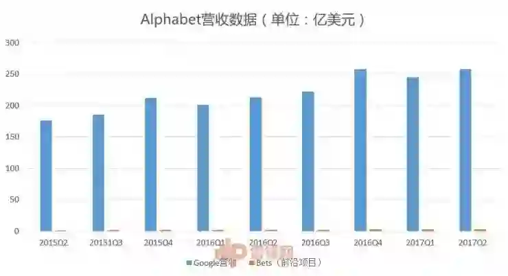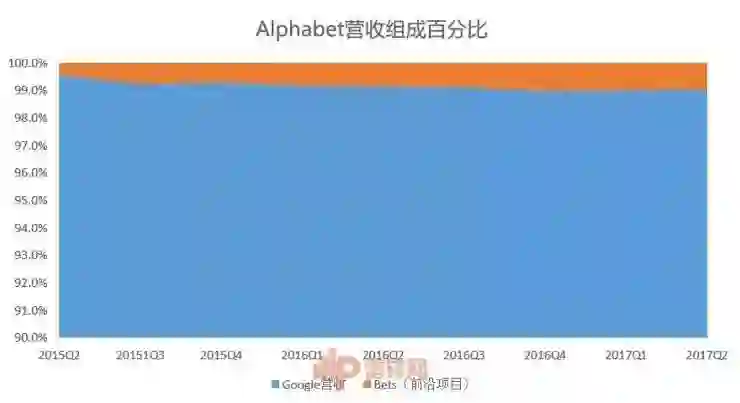 首先是Alphabet的营收组成,从2015Q2至今,Alphabet整体营收中Google,这一互联网部分的占比始终保持在99%之上(2016Q4对应数值为98.995%)。