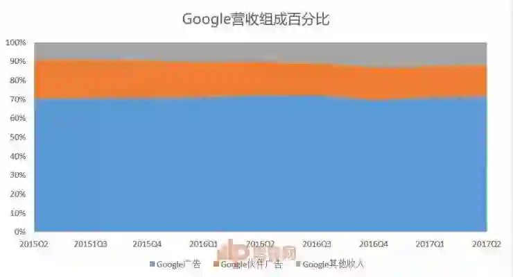 从Google的营收组成来看,组成部分主要有三个:Google自己带来的广告收入、Google合作伙伴的广告收入,其他收入。在2017Q2财报中,三者对应的份额为71.52%、16.49%、11.99%。也就是说,Google营收中广告的部分实际占比接近88%。