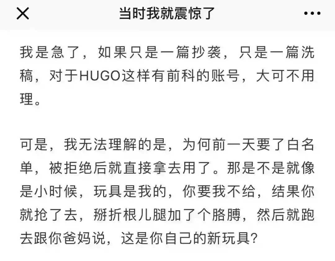 昨天(1月16日),震惊文化旗下大号「当时我就震惊了」发文《HUGO,你丫抄够了没?》,称情感类大号「HUGO」来要白名单被拒,随即洗了自己的文章。