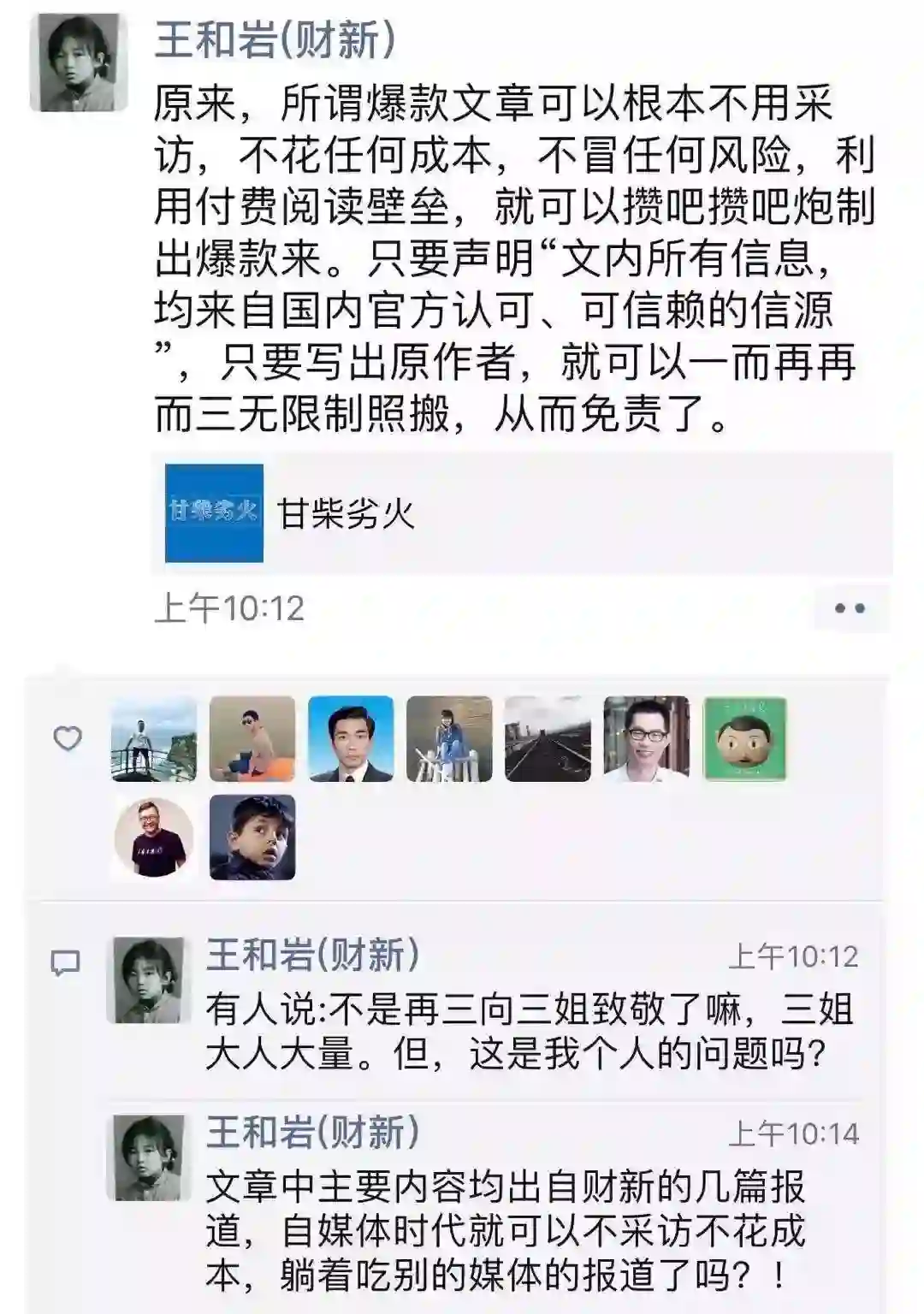 “原来,所谓爆款文章可以根本不用采访,不花任何成本,不冒任何风险,利用付费阅读壁垒,就可以攒把攒吧炮制出爆款来。只要声明‘文内所有信息,均来自国内官方认可、可信赖的信源’,只要写出原作者,就可以一而再再而三无限制照搬,从而免责了。”