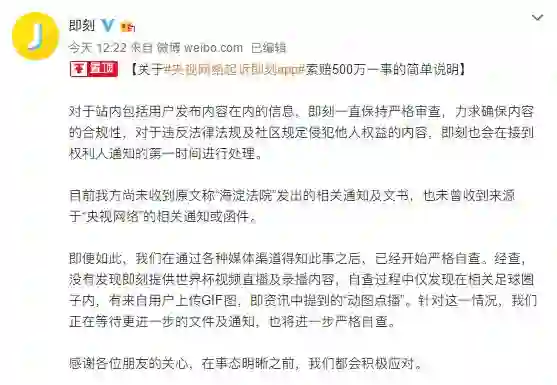 即刻App在世界杯期间没有任何视频直播,甚至主动屏蔽了所有第三方直播链接;即刻App没有提供世界杯视频点播服务;从来没听说过动图点播这个说法;即友发的UGC动图,如果也涉及侵权央视,请给我个支付宝账号。