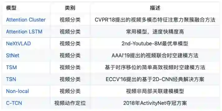 PaddleVideo 目前视频分类和动作定位模型包括:
