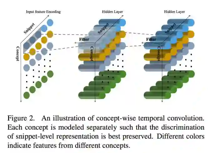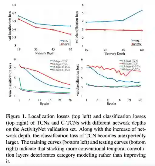 研究现状:当前的主流做法是将视频特征 (时间维度 T*C 单帧图像特征维度) 沿着时间维度做一维卷积设计各种网络结构 1D-TCN,我们实验发现随着网络加深之后网络的分类 loss 较浅层网络结构会差很多,也就是说类别信息在 1D 时序卷积网络中会随着网络变深而慢慢丢失,如下图所示。因此,我们设计了 C-TCN,2D 的保留类别信息的卷积,并且实验证明了 C-TCN 的有效性。