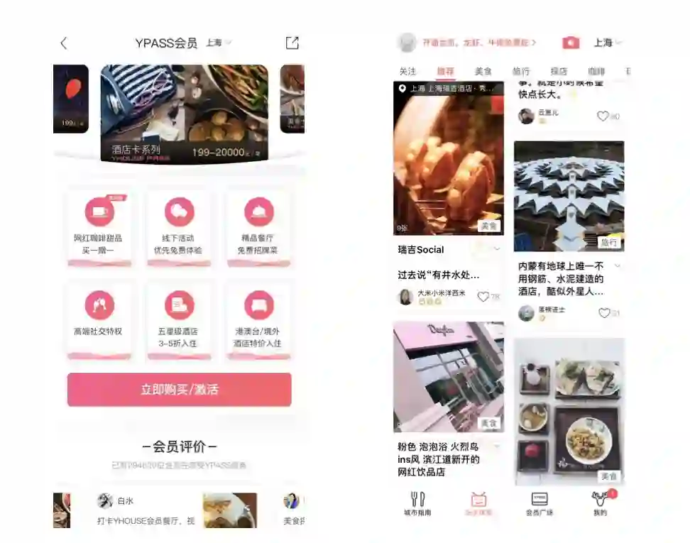 用户作为YPASS会员能够在YHOUSE精选的餐厅、酒店、咖啡、SPA等消费场景获得一系列的「会员特权」,例如免费获得精品餐厅的「美食招牌菜」,获得网红咖啡厅的买一赠一服务,豪华酒店的超低折扣特卖以及为用户免费去热门餐厅代排队等。
