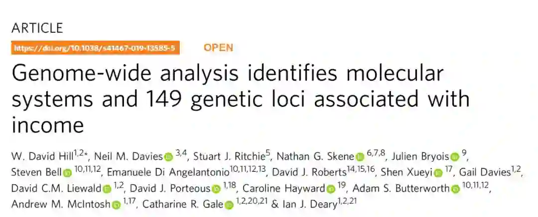 杂志上发表了题为:Genome-wide analysis identifies molecular systems and 149 genetic loci associated with income(全基因组分析确定了与收入相关的分子系统和149个遗传位点)的研究论文。