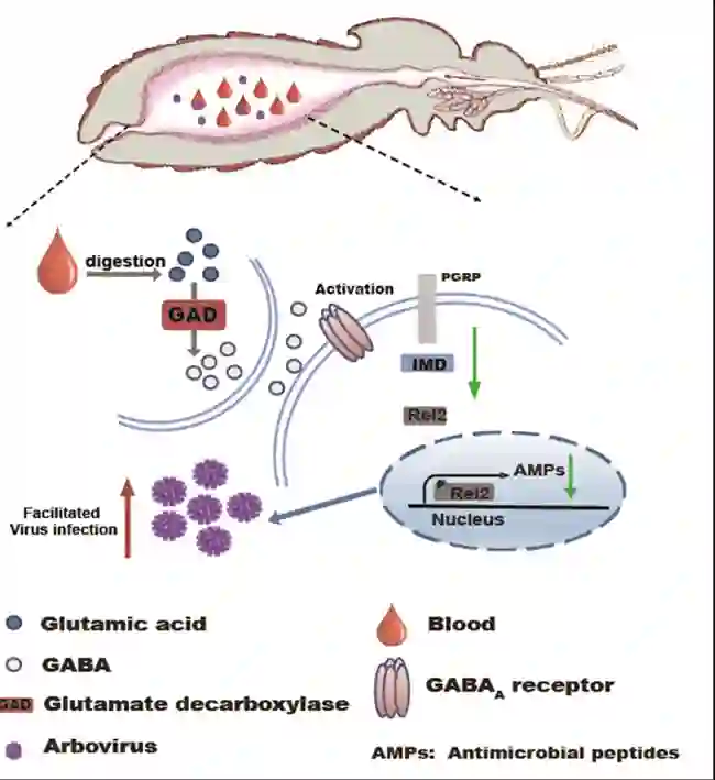 众所周知,蚊虫通过吸食感染宿主的血液获取病毒。宿主的血液蛋白在肠道中会被降解成单个的氨基酸便于蚊虫吸收,而降解产生的谷氨酸 (氨基酸的一种) 是Gama-氨基丁酸的重要原料。由于吸血及蛋白消化过程产生的谷氨酸可以被肠道细胞的谷氨酸脱羧酶(Glutamic Acid Decarboxylase)转化成Gama-氨基丁酸,随后激活Gama-氨基丁酸信号通路,通过抑制蚊虫免疫反应,大幅提高不同种类病毒感染蚊虫的效率(图3)。该项研究阐明了一种辅助多种蚊媒病毒的广谱感染机制在蚊虫体内的感染过程,为深入理解“病毒-蚊媒”之间互作关系提供了新的理论基础。