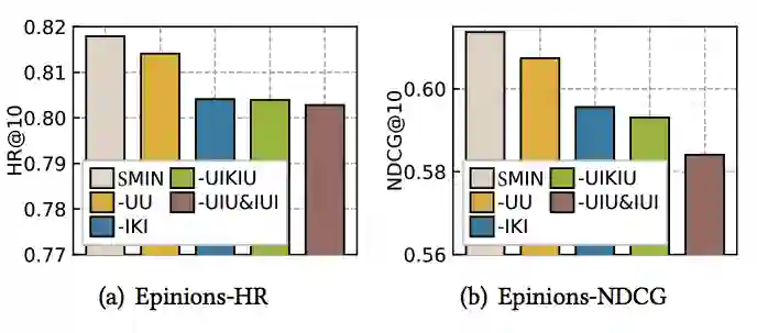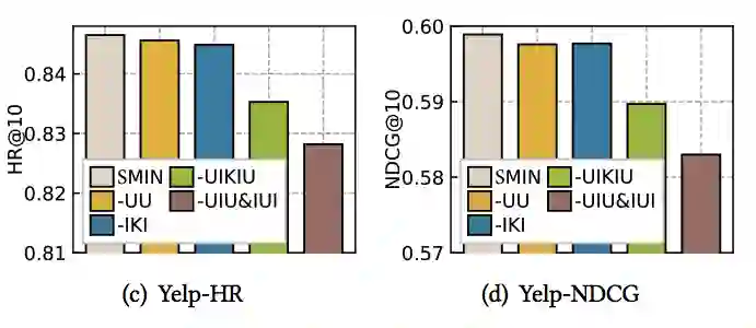 同时,我们针对不同元路径关系也进行了消融实验,以探究不同元路径对模型预测的重要程度。实验结果见下图,其中-代表去除元路径。从结果可以看出,每条元路径在整个 SMIN 框架的推荐效果均有一定的促进作用。