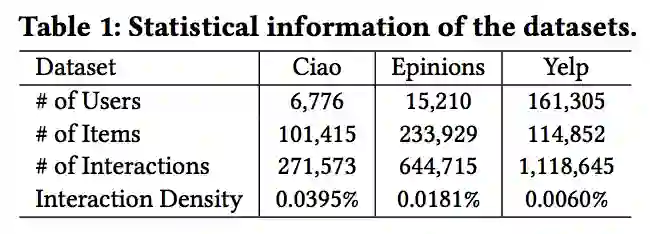 本文在三个推荐数据集上进行实验与模型的验证,数据集均采集自真实的用户平台,统计信息见 Table 1。本文采用隐式反馈任务常用的 leave-one-out 评测模式,对每个测试用户,选取一个购买商品作为测试集中的正例,另选取 99 个未交互商品作为测试负例,使用 Hit Rate@N 和 NDCG@N 作为评测指标。我们将 SMIN 与多个类别的多个 baseline 方法进行了对比实验,并且展示了模型在推荐任务上的优势。