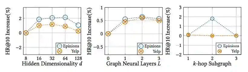 L=2 时模型效果达到最佳,进一步堆叠一层(L=3)性能会变差,这表明我们的异构图体系结构中的二阶连接足以捕获用户和项目之间的多方面关系;互信息模块子结构的 k-hop 相邻关系,我们可以注意到 k=2 时模型性能达到最佳,而通过与高阶(k=3)的全局协作关系进行建模可能会引入一些噪声和不相关的依赖性。