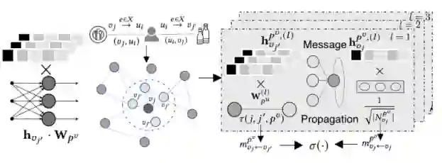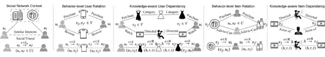 在该研究工作中,我们通过引入商品侧的知识信息和对用户和商品间高阶语义关系的显示编码作为出发点进行探索,提升推荐系统的性能,但同时引入用户社交关系和商品知识信息带来了诸多技术挑战。首先,将用户社交关系和商品知识信息融入到用户-商品交互中,涉及到不同的相互依赖关系,这本质上是异构的,如何在建模中提取异构关系的语义信息,仍然是一个重大的挑战。