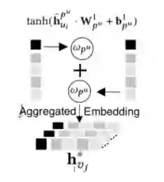 通过上述模块,用户获取了三个基于不同元路径关系图的表征信息,商品获取了两个基于不同元路径关系图的特征表示,考虑到不同元路径对节点表示的贡献是不同的(例如获取用户的购买偏好特征,理论上用户行为关系的影响力相对与社交关系以及具有用户行为影响的商品知识信号的影响力要更大),我们提出一个基于注意力机制的聚合层,来执行跨元路径的信息聚合(以商品为例,见下图所示)。