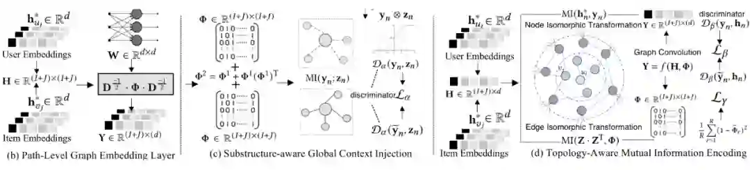 首先将跨元路径聚合后的用户结点特征和商品结点特征,作为用户-商品交互图的初始节点特征,先做一次基于图卷积的消息传递和聚合操作将交互模式注入到特征空间中,然后通过一阶邻接矩阵计算 k 阶邻接矩阵,进而得到以每个结点为中心的 k 阶子图全局特征,最后最大化中心结点特征和 k 阶子图全局特征的互信息。