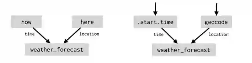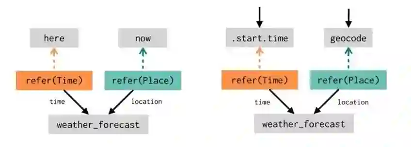 这类引用也可能隐式地发生。想象一下,当你询问智能设备“天气会怎样”时,通常你想知道当地近期的天气。但是,如果你在提到某个未来的事件后问了同样的问题,则可能是在询问该事件期间以及对应地点的天气。解决这两种情况需要两个不同的计算图。如下图所示,左边的计算用于获得当地近期的天气,右侧的计算则用于获得特定事件的天气: