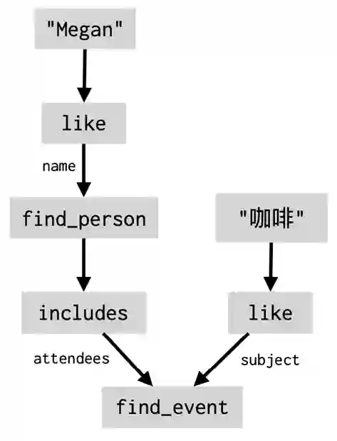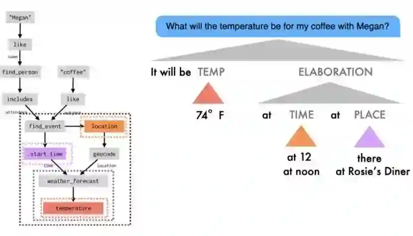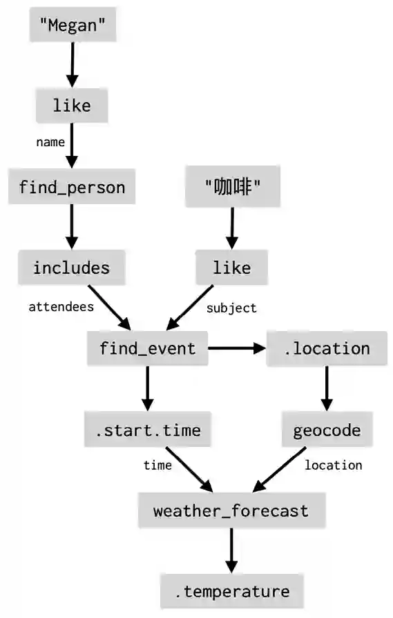 但如何处理更复杂的请求呢?例如“约 Megan 喝咖啡的时候气温如何?”,要回答这个问题,智能助理需要做一系列事情:首先要找出 Megan 是谁,并在日历应用程序中查找包含 Megan 的事件,然后确定其开始时间,并查询该时间的天气服务。为解决这个问题,科研人员不希望添加一个叫做 “和某人在一起期间的天气”的意图,而是希望把自然语言转换为联系所有这些步骤的程序。该程序被表示为数据流图(dataflow graph),它明确定义了智能助理要执行的程序中的步骤(节点)和它们之间的数据依赖关系(边):