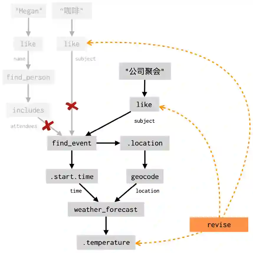 该过程得到的结果与先前为复合式问题(“约 Megan 喝咖啡的时候气温如何”)生成的程序完全相同。这种重用是数据流框架的核心功能——通过对一系列简单的操作进行组合,而不是定义大量的顶层操作,来实现复杂的目标。这种组合可以在第一轮对话中发生,也可以逐轮进行,形成逐步扩展的数据流。