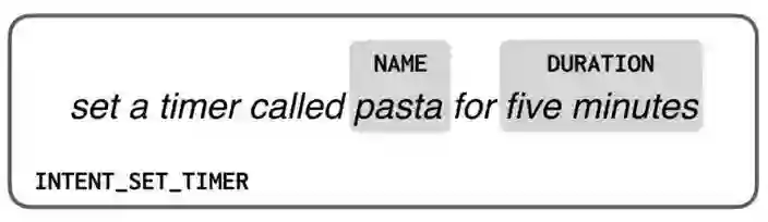 传统的对话系统能够很好地解释固定的、预先定义好的请求,例如“开灯”或者“设置一个5分钟的叫‘意大利面’的闹铃”。在这类方法中,设计人员预先定义了一组固定的意图,每个意图都有一组固定的参数。系统把每个用户请求标记为对应意图和参数的组合: