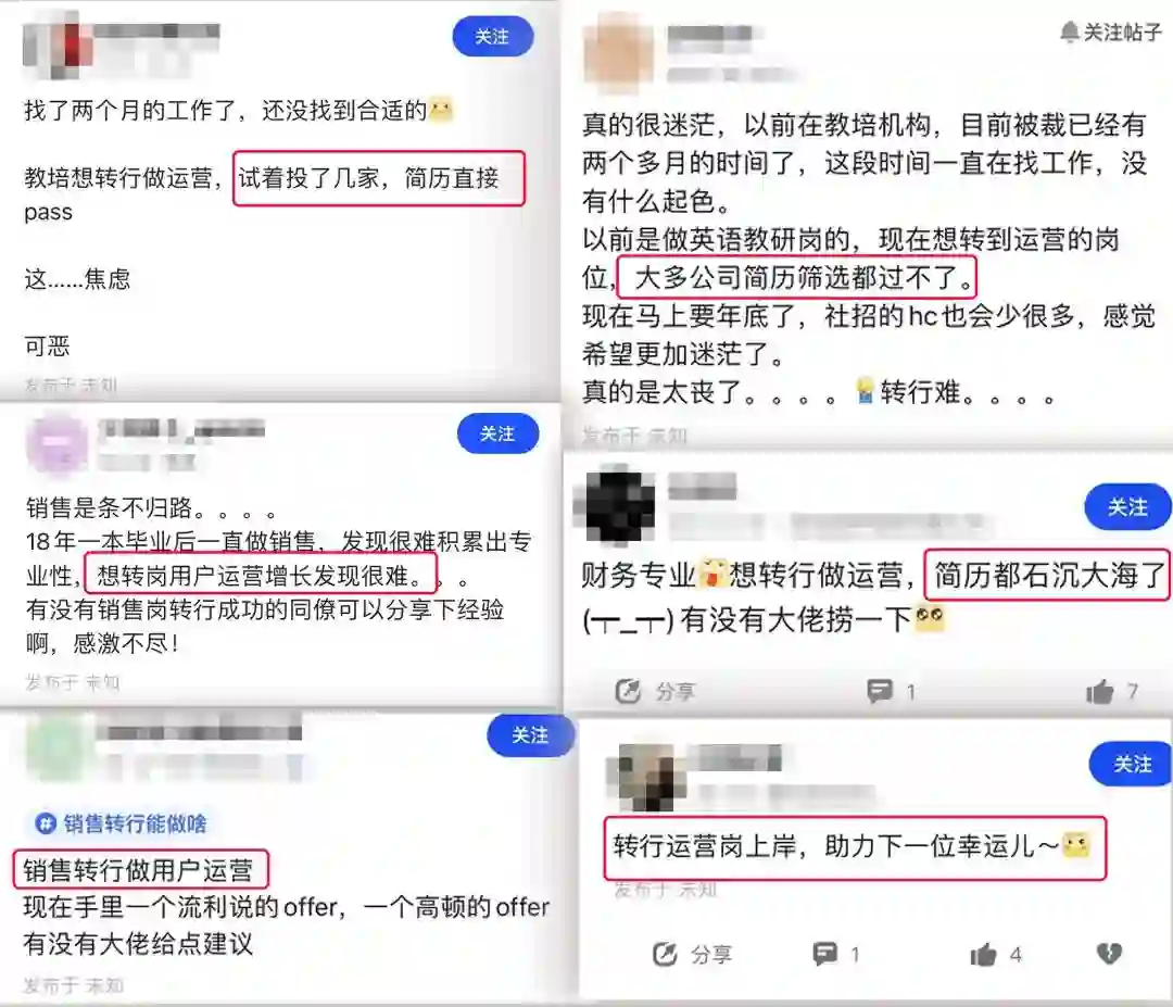 有转行意向的0基础运营新人:不满现状,想转运营,但找不到切入点;